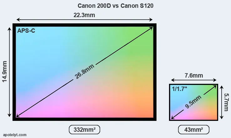 Of the two cameras under consideration, the Canon 200D features an APS-C sensor and the Canon S120 a 1/1.7-inch sensor. The sensor area in the S120 is 87 percent smaller. As a result of these sensor size differences, the cameras have a format factor of, respectively, 1.6 and 4.5. The sensor in the 200D has a native 3:2 aspect ratio, while the one in the S120 offers a 4:3 aspect.