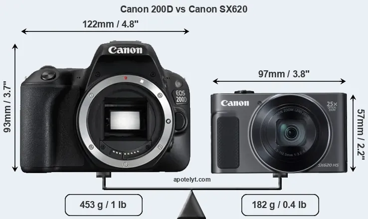 The physical size and weight of the Canon 200D and the Canon SX620 are illustrated in the side-by-side display below. The two cameras are presented according to their relative size. Three successive views from the front, the top, and the rear are shown. All width, height and depth measures are rounded to the nearest millimeter.