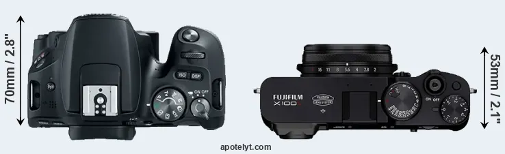 The physical size and weight of the Canon 200D and the Fujifilm X100V are illustrated in the side-by-side display below. The two cameras are presented according to their relative size. Three consecutive views from the front, the top, and the rear side are shown. All size dimensions are rounded to the nearest millimeter.