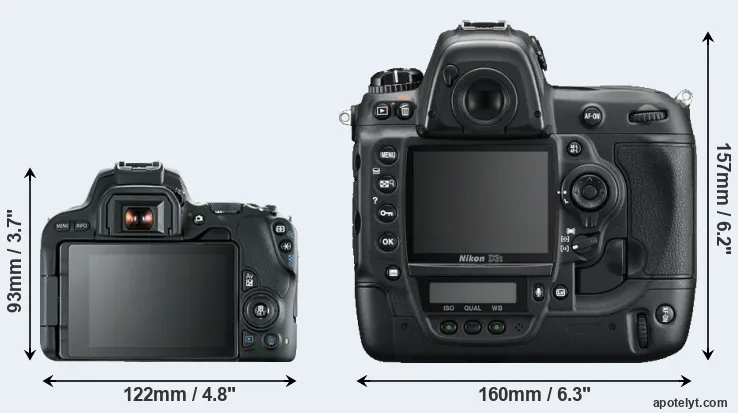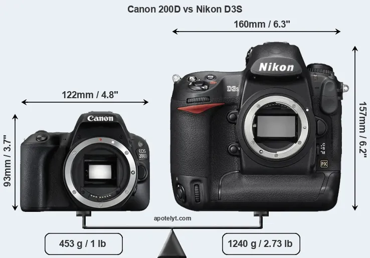 The side-by-side display below illustrates the physical size and weight of the Canon 200D and the Nikon D3S. The two cameras are presented according to their relative size. Three consecutive perspectives from the front, the top, and the back are available. All width, height and depth dimensions are rounded to the nearest millimeter.