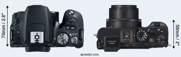 The physical size and weight of the Canon 200D and the Nikon P7800 are illustrated in the side-by-side display below. The two cameras are presented according to their relative size. Three consecutive views from the front, the top, and the rear side are shown. All size dimensions are rounded to the nearest millimeter.