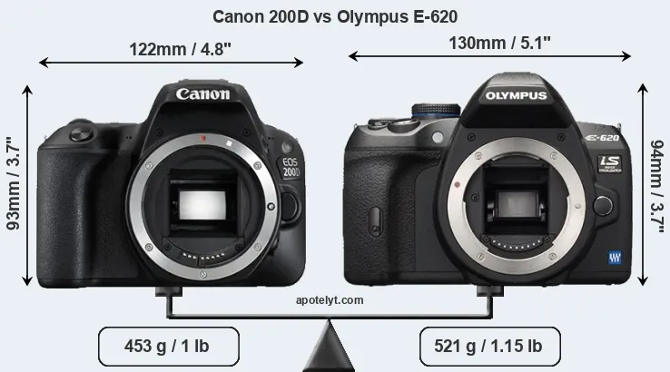 The side-by-side display below illustrates the physical size and weight of the Canon 200D and the Olympus E-620. The two cameras are presented according to their relative size. Three successive views from the front, the top, and the rear are shown. All width, height and depth measures are rounded to the nearest millimeter.