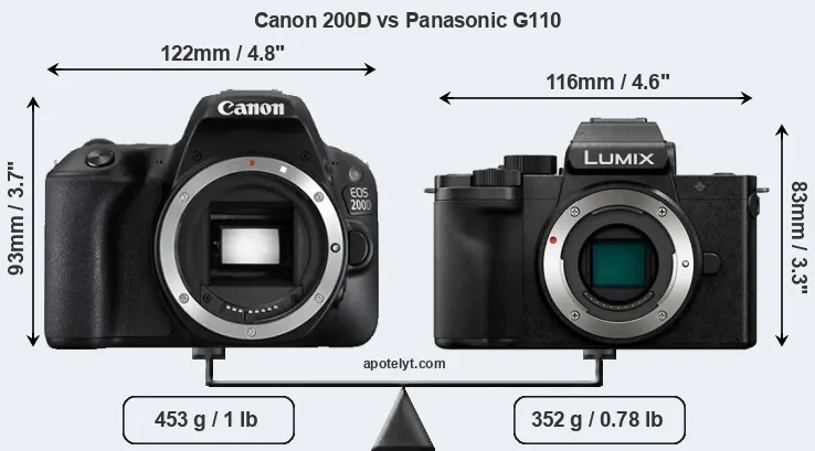 Going beyond this snapshot of core features and characteristics, what are the differences between the Canon EOS 200D and the Panasonic Lumix DC-G110? Which one should you buy? Read on to find out how these two cameras compare with respect to their body size, their imaging sensors, their shooting features, their input-output connections, and their reception by expert reviewers.