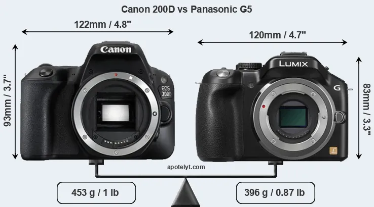 The physical size and weight of the Canon 200D and the Panasonic G5 are illustrated in the side-by-side display below. The two cameras are presented according to their relative size. Three consecutive perspectives from the front, the top, and the back are available. All width, height and depth measures are rounded to the nearest millimeter.