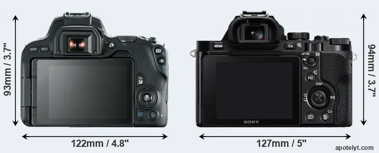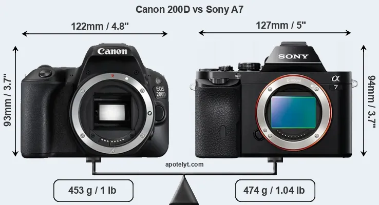 The Canon EOS 200D (called Canon SL2 in some regions) and the Sony Alpha A7 are two digital cameras that were announced, respectively, in June 2017 and October 2013. The 200D is a DSLR, while the A7 is a mirrorless interchangeable lens camera. The cameras are based on an APS-C (200D) and a full frame (A7) sensor. Both cameras offer a resolution of 24 megapixels.
