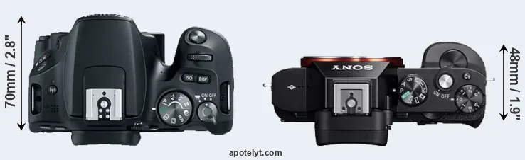 An illustration of the physical size and weight of the Canon 200D and the Sony A7 is provided in the side-by-side display below. The two cameras are presented according to their relative size. Three consecutive views from the front, the top, and the rear side are shown. All width, height and depth measures are rounded to the nearest millimeter.