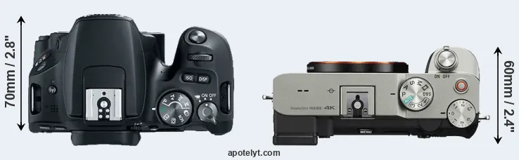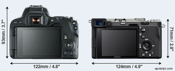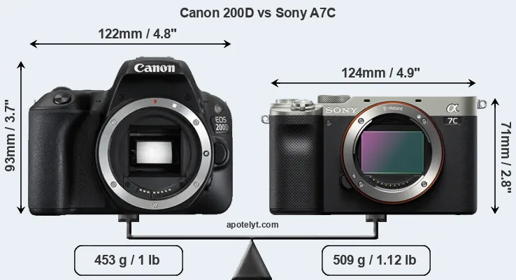 The side-by-side display below illustrates the physical size and weight of the Canon 200D and the Sony A7C. The two cameras are presented according to their relative size. Three consecutive perspectives from the front, the top, and the back are available. All width, height and depth measures are rounded to the nearest millimeter.