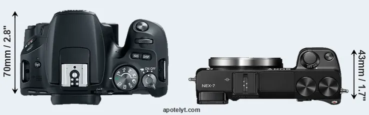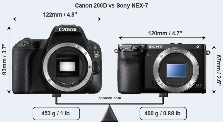 The side-by-side display below illustrates the physical size and weight of the Canon 200D and the Sony NEX-7. The two cameras are presented according to their relative size. Three consecutive views from the front, the top, and the rear side are shown. All width, height and depth dimensions are rounded to the nearest millimeter.