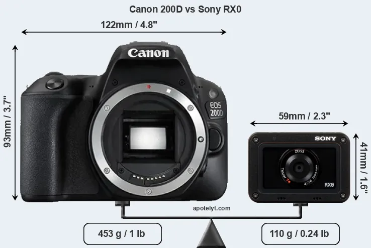 The physical size and weight of the Canon 200D and the Sony RX0 are illustrated in the side-by-side display below. The two cameras are presented according to their relative size. Three consecutive views from the front, the top, and the rear side are shown. All width, height and depth measures are rounded to the nearest millimeter.