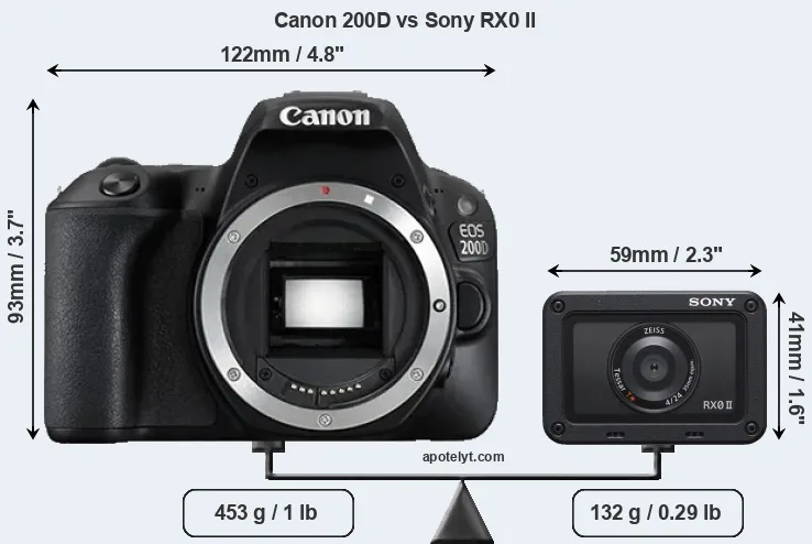 The physical size and weight of the Canon 200D and the Sony RX0 II are illustrated in the side-by-side display below. The two cameras are presented according to their relative size. Three consecutive views from the front, the top, and the rear side are shown. All width, height and depth measures are rounded to the nearest millimeter.