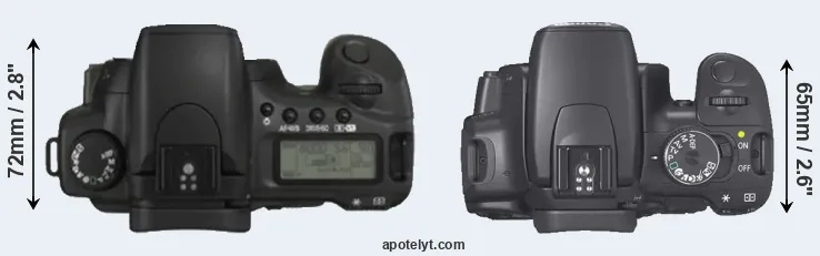 The side-by-side display below illustrates the physical size and weight of the Canon 20D and the Canon 400D. The two cameras are presented according to their relative size. Three consecutive perspectives from the front, the top, and the back are available. All size dimensions are rounded to the nearest millimeter.