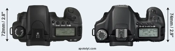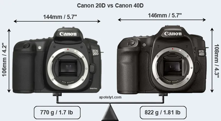 An illustration of the physical size and weight of the Canon 20D and the Canon 40D is provided in the side-by-side display below. The two cameras are presented according to their relative size. Three successive views from the front, the top, and the rear are shown. All width, height and depth dimensions are rounded to the nearest millimeter.