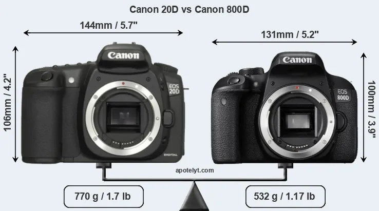 An illustration of the physical size and weight of the Canon 20D and the Canon 800D is provided in the side-by-side display below. The two cameras are presented according to their relative size. Three consecutive perspectives from the front, the top, and the back are available. All width, height and depth dimensions are rounded to the nearest millimeter.