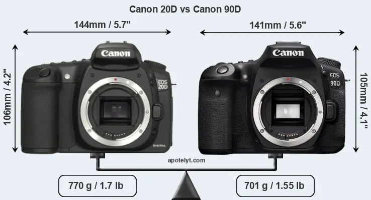 The physical size and weight of the Canon 20D and the Canon 90D are illustrated in the side-by-side display below. The two cameras are presented according to their relative size. Three consecutive views from the front, the top, and the rear side are shown. All size dimensions are rounded to the nearest millimeter.
