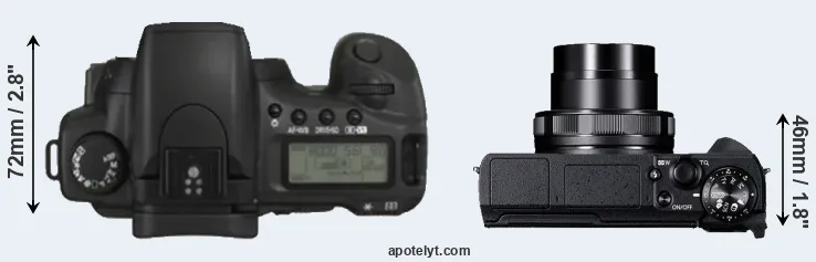 If the front view area (width x height) of the cameras is taken as an aggregate measure of their size, the Canon G5 X Mark II is considerably smaller (56 percent) than the Canon 20D. In this context, it is worth noting that neither the 20D nor the G5X Mark II are weather-sealed.