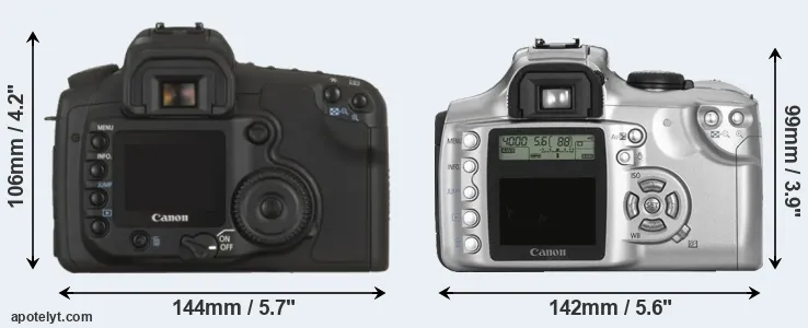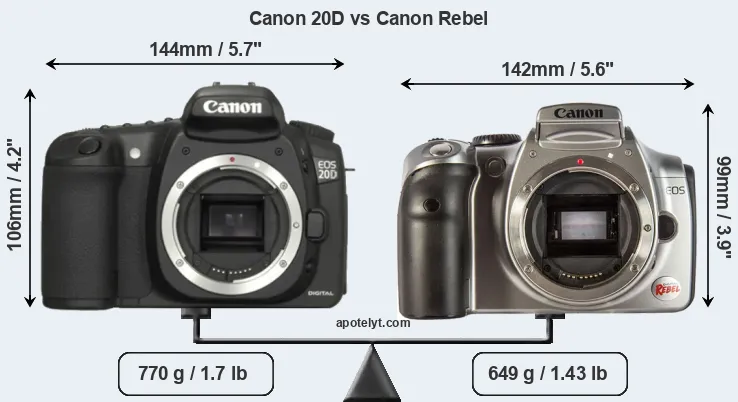 An illustration of the physical size and weight of the Canon 20D and the Canon Rebel is provided in the side-by-side display below. The two cameras are presented according to their relative size. Three successive views from the front, the top, and the rear are shown. All size dimensions are rounded to the nearest millimeter.