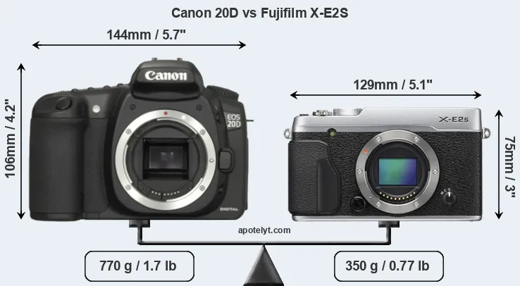 If the front view area (width x height) of the cameras is taken as an aggregate measure of their size, the Fujifilm X-E2S is considerably smaller (37 percent) than the Canon 20D. Moreover, the X-E2S is substantially lighter (55 percent) than the 20D. In this context, it is worth noting that neither the 20D nor the X-E2S are weather-sealed.