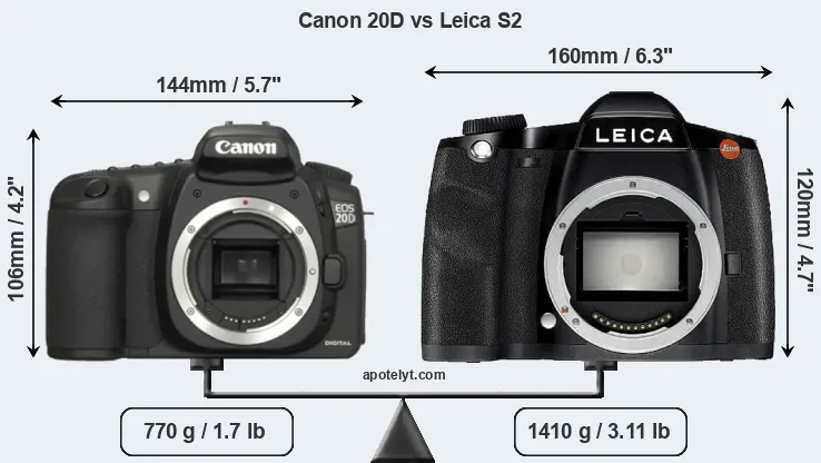 If the front view area (width x height) of the cameras is taken as an aggregate measure of their size, the Leica S2 is notably larger (26 percent) than the Canon 20D. Moreover, the S2 is substantially heavier (83 percent) than the 20D. It is noteworthy in this context that the S2 is splash and dust-proof, while the 20D does not feature any corresponding weather-sealing.