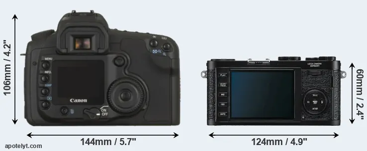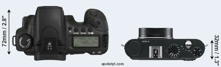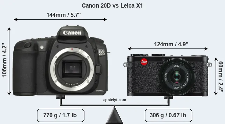 The side-by-side display below illustrates the physical size and weight of the Canon 20D and the Leica X1. The two cameras are presented according to their relative size. Three successive views from the front, the top, and the rear are shown. All width, height and depth measures are rounded to the nearest millimeter.