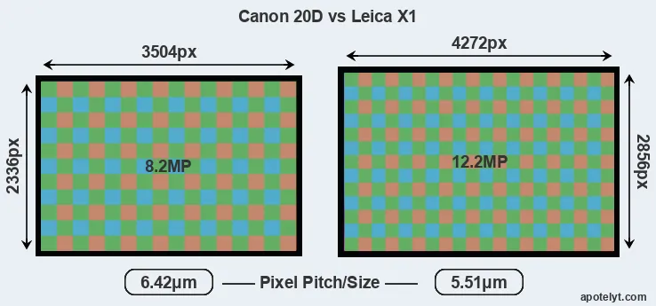With 12.2MP, the X1 offers a higher resolution than the 20D (8.2MP), but the X1 has smaller individual pixels (pixel pitch of 5.51μm versus 6.42μm for the 20D). Yet, the X1 is a much more recent model (by 5 years) than the 20D, and its sensor will have benefitted from technological advances during this time that enhance the light gathering capacity of its pixel-units.