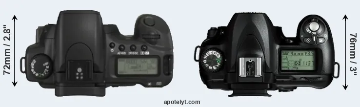 An illustration of the physical size and weight of the Canon 20D and the Nikon D50 is provided in the side-by-side display below. The two cameras are presented according to their relative size. Three successive views from the front, the top, and the rear are shown. All width, height and depth measures are rounded to the nearest millimeter.