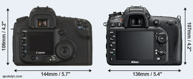 The side-by-side display below illustrates the physical size and weight of the Canon 20D and the Nikon D7200. The two cameras are presented according to their relative size. Three successive views from the front, the top, and the rear are shown. All width, height and depth measures are rounded to the nearest millimeter.