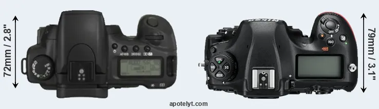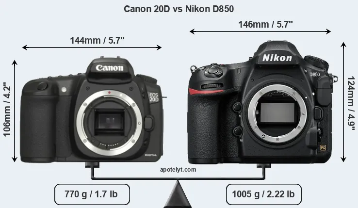 An illustration of the physical size and weight of the Canon 20D and the Nikon D850 is provided in the side-by-side display below. The two cameras are presented according to their relative size. Three successive views from the front, the top, and the rear are shown. All size dimensions are rounded to the nearest millimeter.