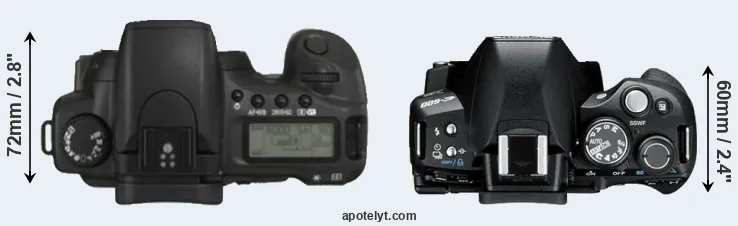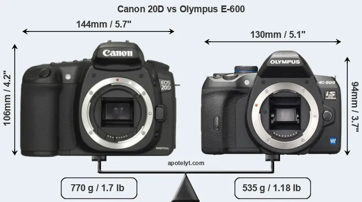 The side-by-side display below illustrates the physical size and weight of the Canon 20D and the Olympus E-600. The two cameras are presented according to their relative size. Three successive views from the front, the top, and the rear are shown. All width, height and depth measures are rounded to the nearest millimeter.