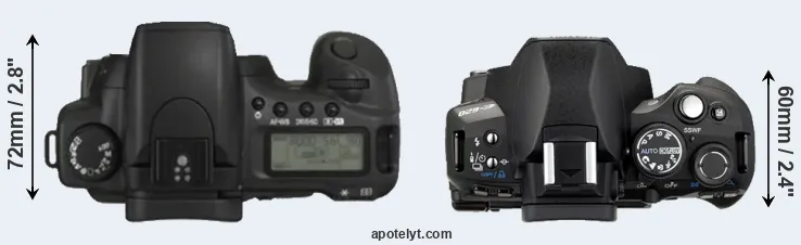 The side-by-side display below illustrates the physical size and weight of the Canon 20D and the Olympus E-620. The two cameras are presented according to their relative size. Three successive views from the front, the top, and the rear are shown. All width, height and depth measures are rounded to the nearest millimeter.