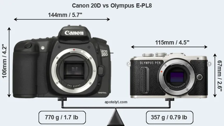 If the front view area (width x height) of the cameras is taken as an aggregate measure of their size, the Olympus E-PL8 is considerably smaller (50 percent) than the Canon 20D. Moreover, the E-PL8 is substantially lighter (54 percent) than the 20D. In this context, it is worth noting that neither the 20D nor the E-PL8 are weather-sealed.