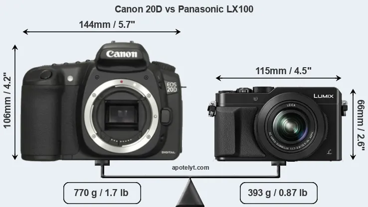 The above size and weight comparisons are to some extent incomplete and possibly misleading, as the LX100 has a lens built in, whereas the 20D is an interchangeable lens camera that requires a separate lens. Attaching the latter will add extra weight and bulk to the setup. You can compare the optics available for the 20D and their specifications in the Canon EF Lens Catalog.