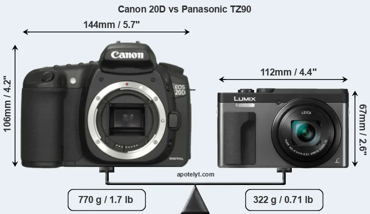 The physical size and weight of the Canon 20D and the Panasonic TZ90 are illustrated in the side-by-side display below. The two cameras are presented according to their relative size. Three consecutive perspectives from the front, the top, and the back are available. All width, height and depth measures are rounded to the nearest millimeter.