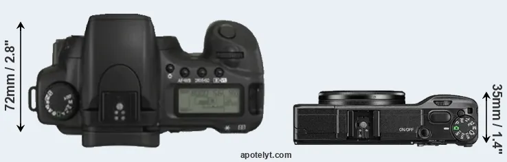 The side-by-side display below illustrates the physical size and weight of the Canon 20D and the Ricoh GR II. The two cameras are presented according to their relative size. Three consecutive perspectives from the front, the top, and the back are available. All width, height and depth measures are rounded to the nearest millimeter.