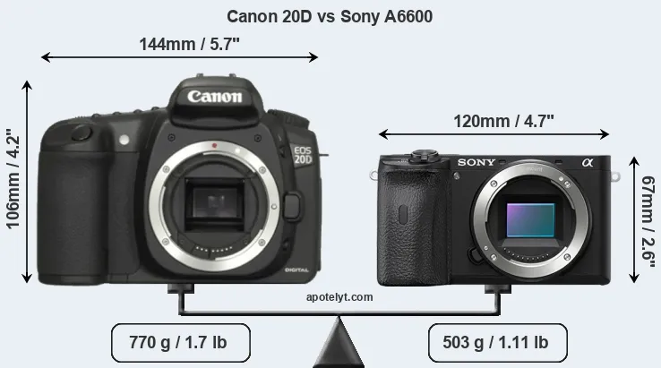 If the front view area (width x height) of the cameras is taken as an aggregate measure of their size, the Sony A6600 is considerably smaller (47 percent) than the Canon 20D. Moreover, the A6600 is substantially lighter (35 percent) than the 20D. It is noteworthy in this context that the A6600 is splash and dust-proof, while the 20D does not feature any corresponding weather-sealing.