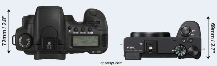 The physical size and weight of the Canon 20D and the Sony A6600 are illustrated in the side-by-side display below. The two cameras are presented according to their relative size. Three consecutive views from the front, the top, and the rear side are shown. All width, height and depth dimensions are rounded to the nearest millimeter.