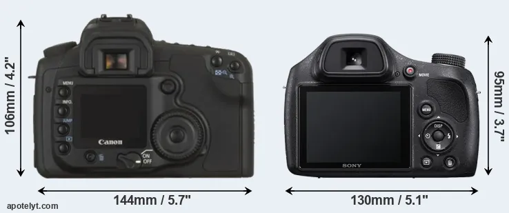 The side-by-side display below illustrates the physical size and weight of the Canon 20D and the Sony H400. The two cameras are presented according to their relative size. Three successive views from the front, the top, and the rear are shown. All size dimensions are rounded to the nearest millimeter.