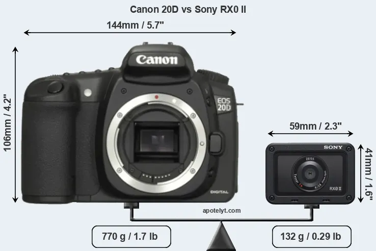 The above size and weight comparisons are to some extent incomplete and possibly misleading, as the RX0 II has a lens built in, whereas the 20D is an interchangeable lens camera that requires a separate lens. Attaching the latter will add extra weight and bulk to the setup. You can compare the optics available for the 20D and their specifications in the Canon EF Lens Catalog.