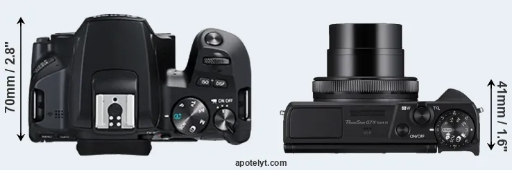 The above size and weight comparisons are to some extent incomplete and possibly misleading, as the G7X Mark III has a lens built in, whereas the 250D is an interchangeable lens camera that requires a separate lens. Attaching the latter will add extra weight and bulk to the setup. You can compare the optics available for the 250D and their specifications in the Canon EF Lens Catalog.