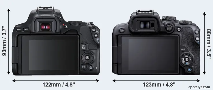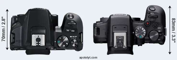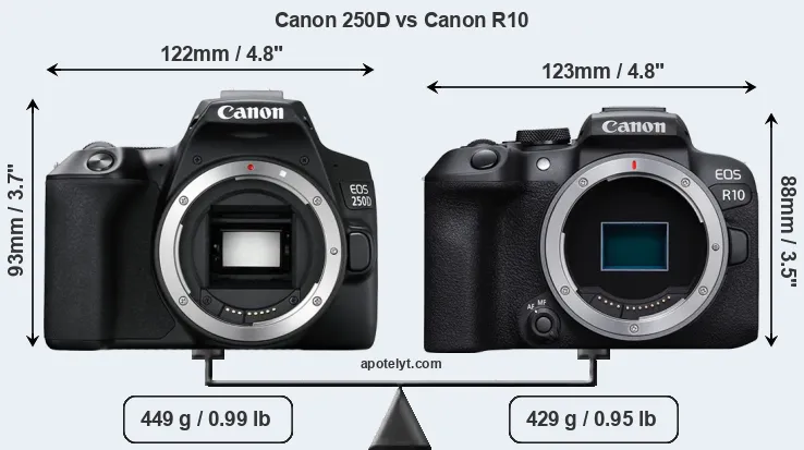 The side-by-side display below illustrates the physical size and weight of the Canon 250D and the Canon R10. The two cameras are presented according to their relative size. Three successive views from the front, the top, and the rear are shown. All width, height and depth measures are rounded to the nearest millimeter.