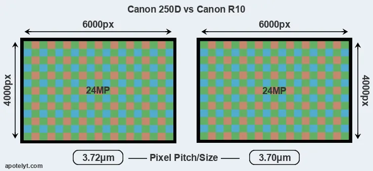 Even though the 250D has a slightly larger sensor, both cameras offer the same resolution of 24 megapixels. This implies that the 250D has a lower pixel density and larger individual pixels (with a pixel pitch of 3.72μm versus 3.70μm for the R10), which gives it a potential advantage in terms of light gathering capacity. It should, however, be noted that the R10 is much more recent (by 3 years and 1 month) than the 250D, and its sensor will have benefitted from technological advances during this time that at least partly compensate for the smaller pixel size.