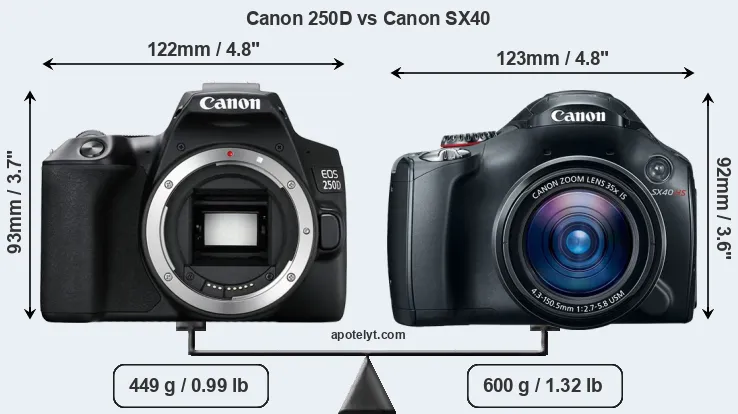 An illustration of the physical size and weight of the Canon 250D and the Canon SX40 is provided in the side-by-side display below. The two cameras are presented according to their relative size. Three successive views from the front, the top, and the rear are shown. All size dimensions are rounded to the nearest millimeter.