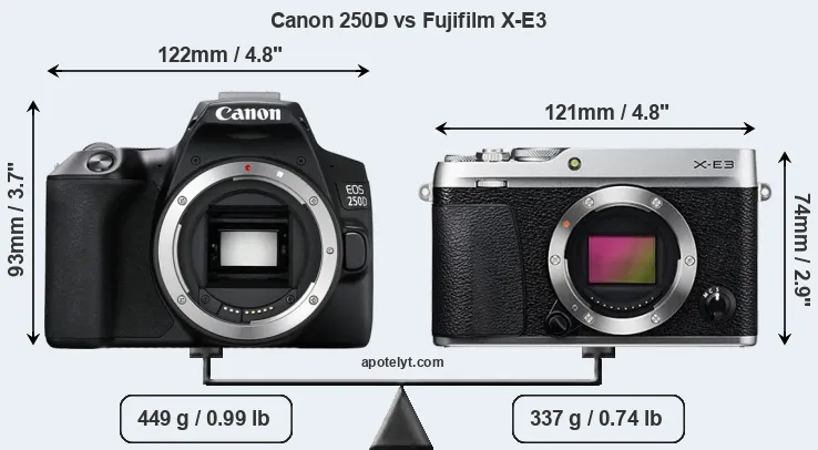 An illustration of the physical size and weight of the Canon 250D and the Fujifilm X-E3 is provided in the side-by-side display below. The two cameras are presented according to their relative size. Three successive views from the front, the top, and the rear are shown. All width, height and depth dimensions are rounded to the nearest millimeter.