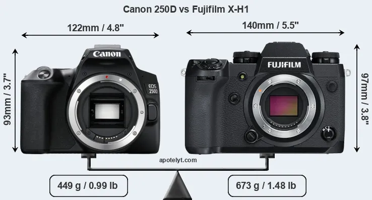The Canon EOS 250D (called Canon SL3 in some regions) and the Fujifilm X-H1 are two digital cameras that were revealed to the public, respectively, in April 2019 and February 2018. The 250D is a DSLR, while the X-H1 is a mirrorless interchangeable lens camera. Both cameras are equipped with an APS-C sensor. Both cameras offer a resolution of 24 megapixels.