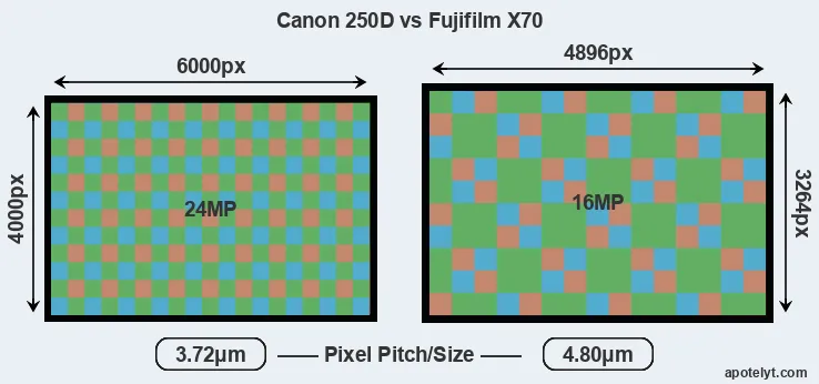 Despite having a smaller sensor, the Canon 250D offers a higher resolution of 24 megapixels, compared with 16 MP of the Fujifilm X70. This megapixels advantage comes at the cost of a higher pixel density and a smaller size of the individual pixel (with a pixel pitch of 3.72μm versus 4.80μm for the X70). However, it should be noted that the 250D is much more recent (by 3 years and 2 months) than the X70, and its sensor will have benefitted from technological advances during this time that make it possible to gather light more efficiently. Coming back to sensor resolution, it should be mentioned that the X70 has no anti-alias filter installed, so that it can capture all the detail its sensor resolves.