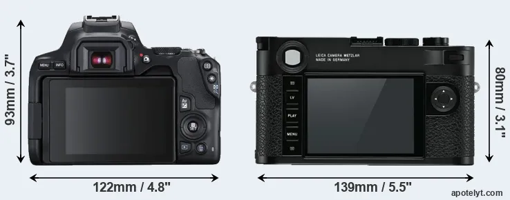 If the front view area (width x height) of the cameras is taken as an aggregate measure of their size, the Leica M10 is somewhat smaller (2 percent) than the Canon 250D. However, the M10 is substantially heavier (47 percent) than the 250D. It is noteworthy in this context that the M10 is splash and dust-proof, while the 250D does not feature any corresponding weather-sealing.