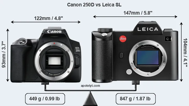 If the front view area (width x height) of the cameras is taken as an aggregate measure of their size, the Leica SL is notably larger (35 percent) than the Canon 250D. Moreover, the Leica SL is substantially heavier (89 percent) than the 250D. It is noteworthy in this context that the Leica SL is splash and dust-proof, while the 250D does not feature any corresponding weather-sealing.