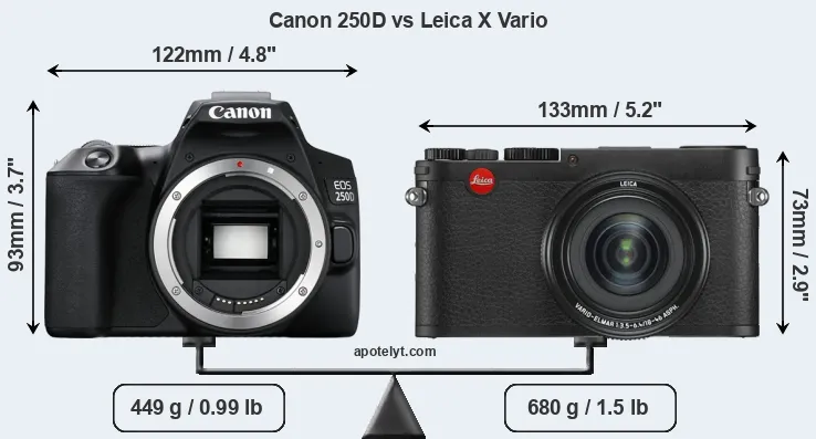 The side-by-side display below illustrates the physical size and weight of the Canon 250D and the Leica X Vario. The two cameras are presented according to their relative size. Three successive views from the front, the top, and the rear are shown. All size dimensions are rounded to the nearest millimeter.