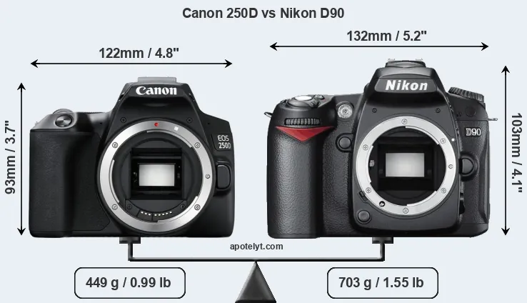 The physical size and weight of the Canon 250D and the Nikon D90 are illustrated in the side-by-side display below. The two cameras are presented according to their relative size. Three successive views from the front, the top, and the rear are shown. All width, height and depth dimensions are rounded to the nearest millimeter.