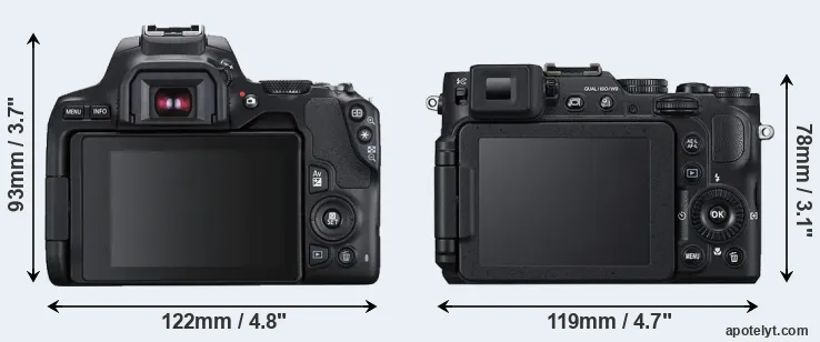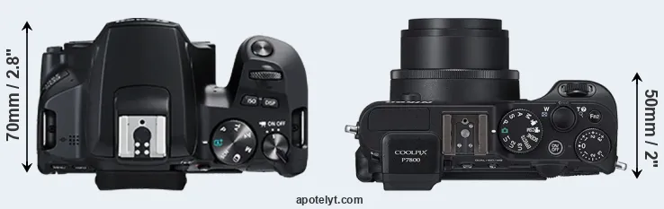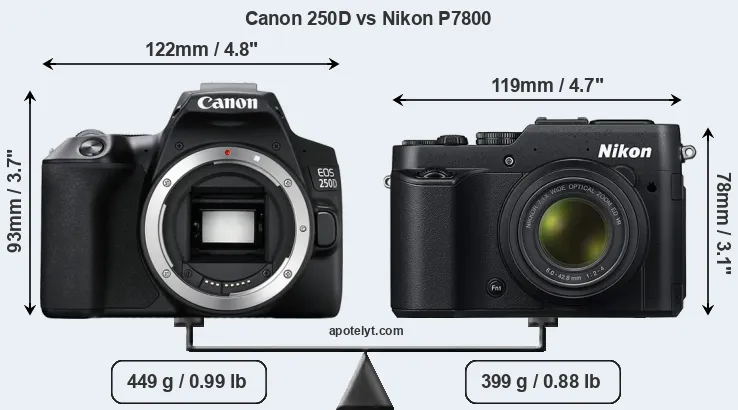 The physical size and weight of the Canon 250D and the Nikon P7800 are illustrated in the side-by-side display below. The two cameras are presented according to their relative size. Three consecutive perspectives from the front, the top, and the back are available. All width, height and depth dimensions are rounded to the nearest millimeter.