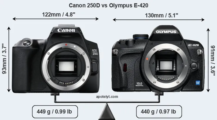 The side-by-side display below illustrates the physical size and weight of the Canon 250D and the Olympus E-420. The two cameras are presented according to their relative size. Three successive views from the front, the top, and the rear are shown. All width, height and depth dimensions are rounded to the nearest millimeter.